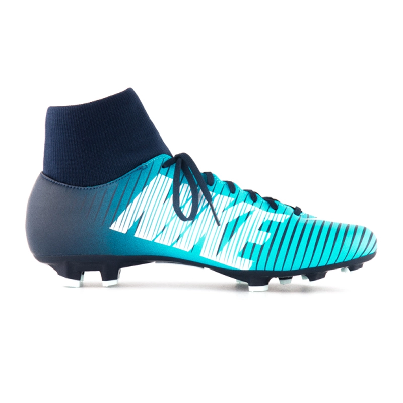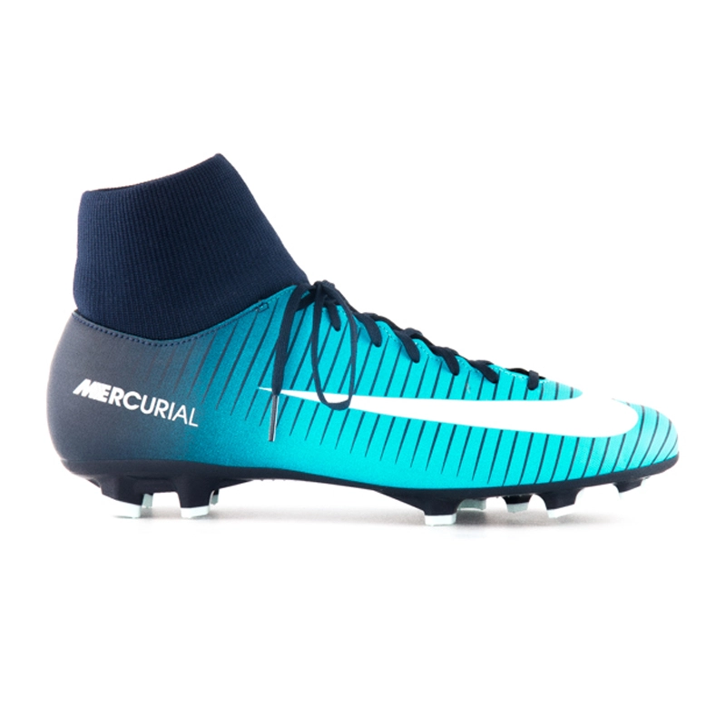 Купити Nike Mercurial Victory VI DF FG варто ще й через м'який еластичний манжет — він щільно охоплює ногу і не дозволяє їй прослизати, захищає суглоби від травм. Ще одна особливість — це симетрична шнурівка, що дозволяє легко регулювати щільність фіксації.